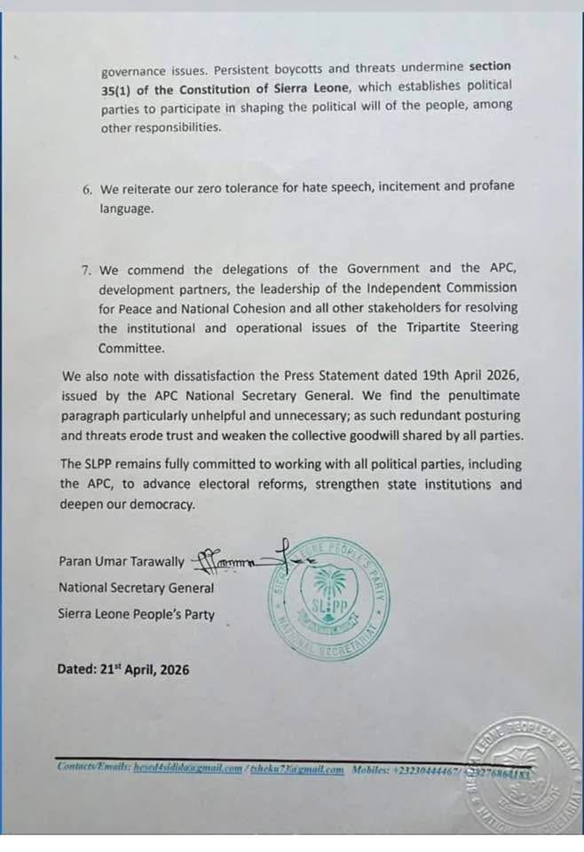 According to the SLPP, the proposed committee raises significant constitutional and institutional concerns, particularly in relation to the independence of the Electoral Commission for Sierra Leone (ECSL). The party maintains that the ECSL is a constitutionally established body mandated to operate independently and free from political interference, in order to safeguard the credibility, transparency, and fairness of elections.