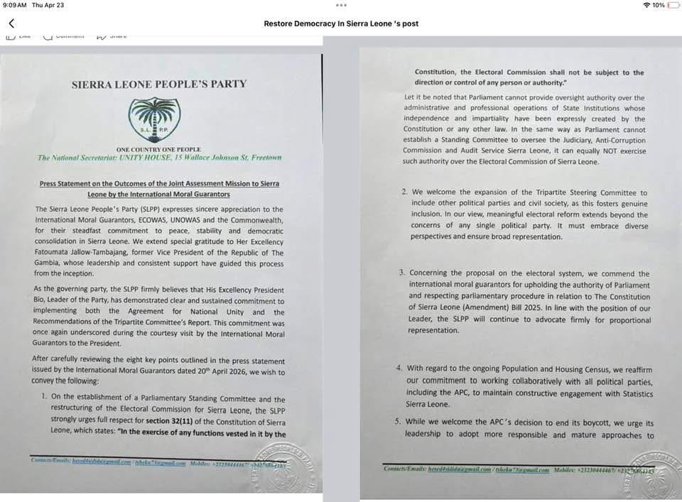 The Sierra Leone Peopleβs Party (SLPP) has formally rejected a proposal for the establishment of a Parliamentary Standing Committee on Electoral Matters, a recommendation advanced by a group of stakeholders referred to as moral guarantors.